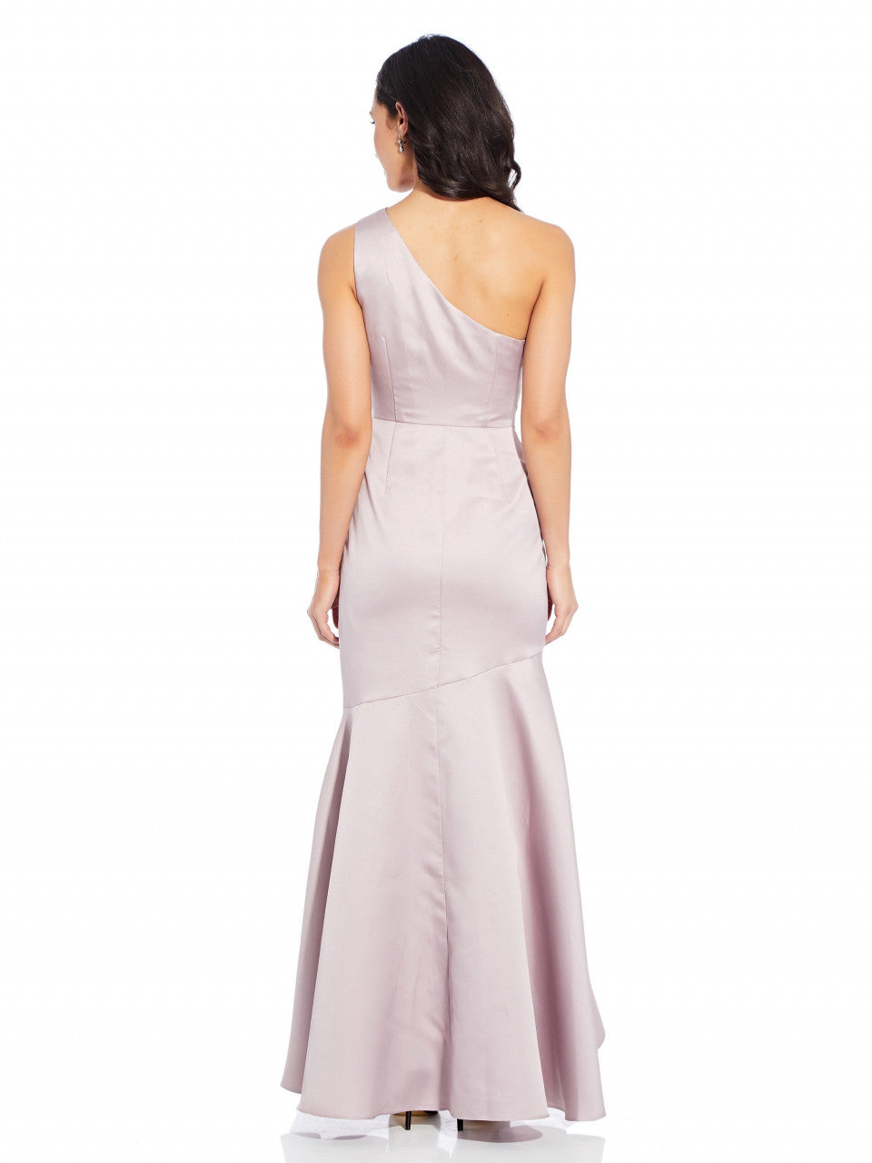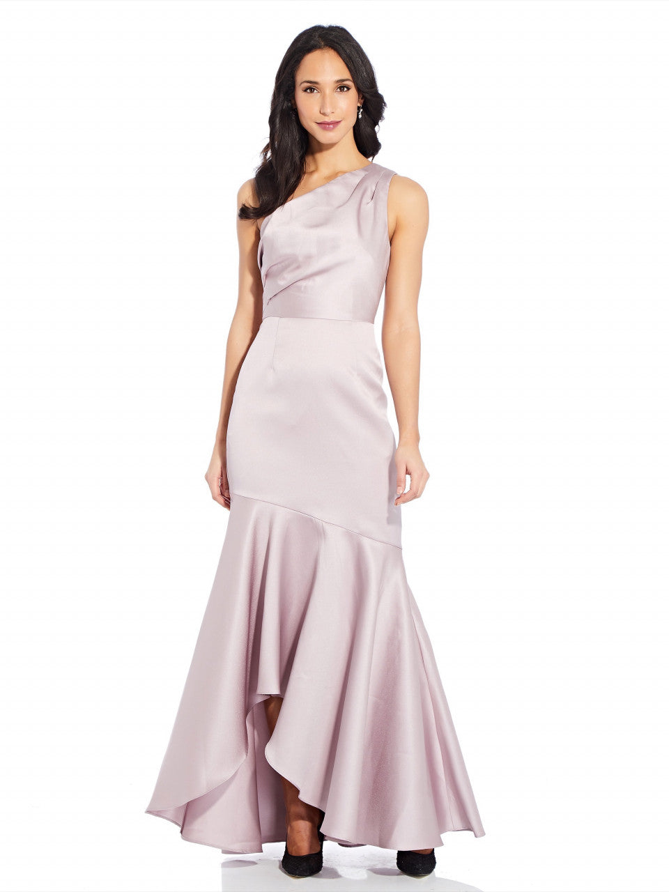 This long mikado gown features a one-shoulder neckline and a high-low mermaid skirt.