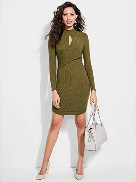 This rib-knit dress features a cutout front detail, a mock neck and long sleeves for a sultry look.