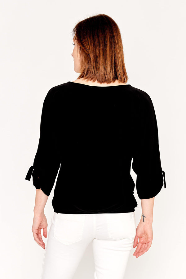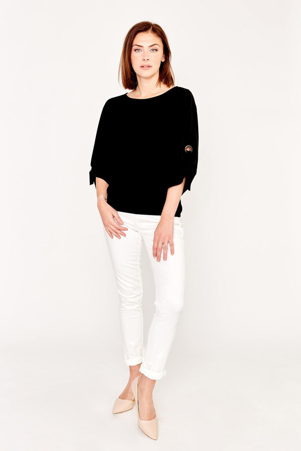 This top from Joseph Ribkoff combines simplicity with originality, with its plain tone and classic round collar. You'll love all the details of this top, with its elastic waistband and three-quarter length sleeves rolled up with a tie.