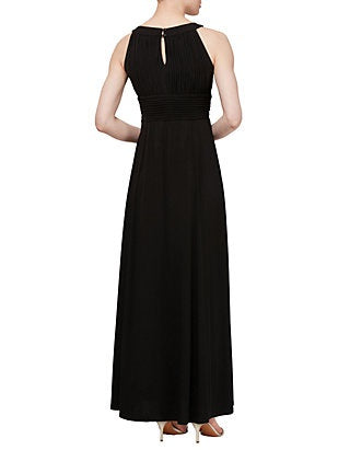 With a ruched bust and waist, this long maxi dress from SLNY is destined to stand out.