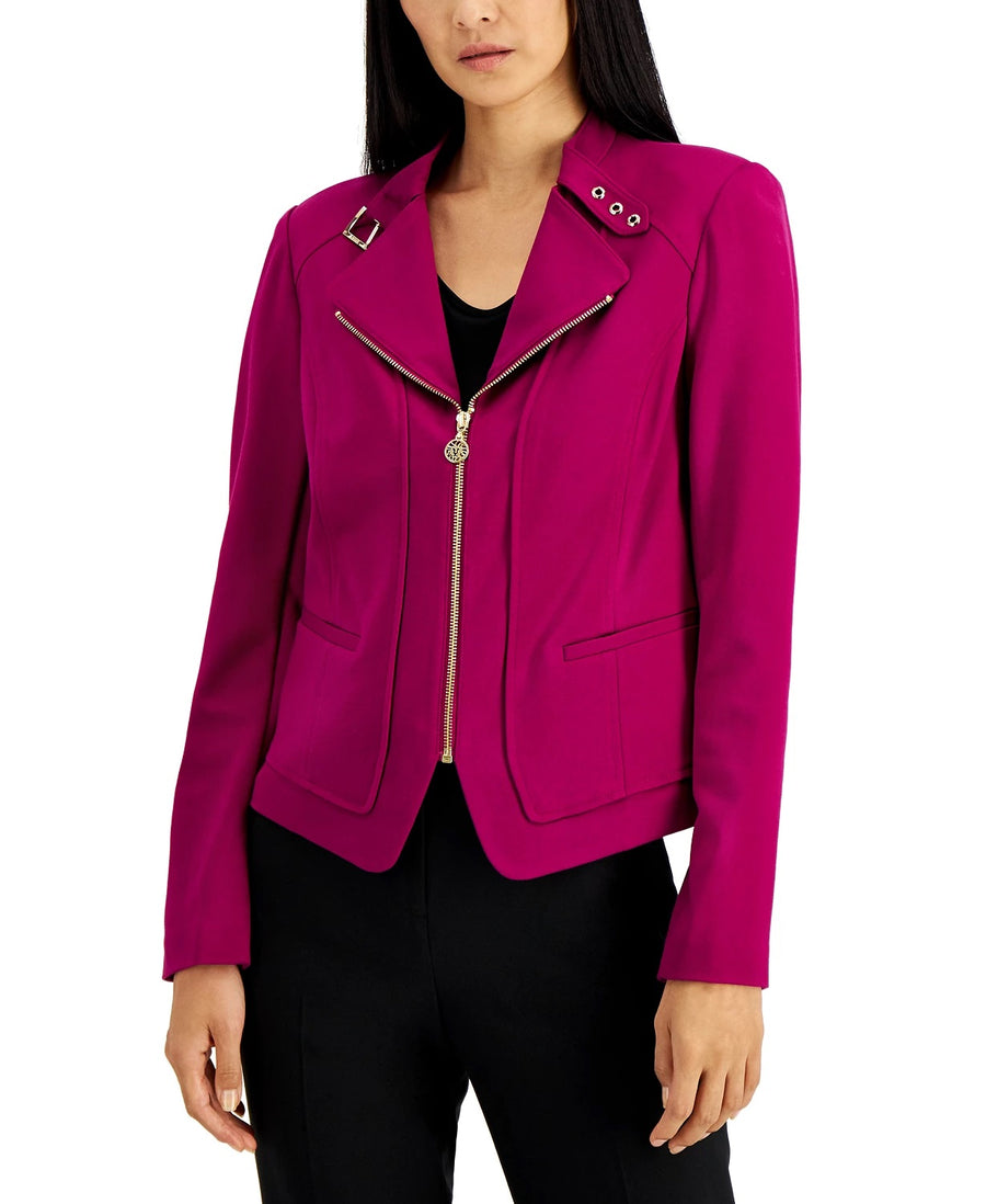 Promotion-worthy style is yours in this sleek Anne Klein moto jacket designed with a buckled collar.