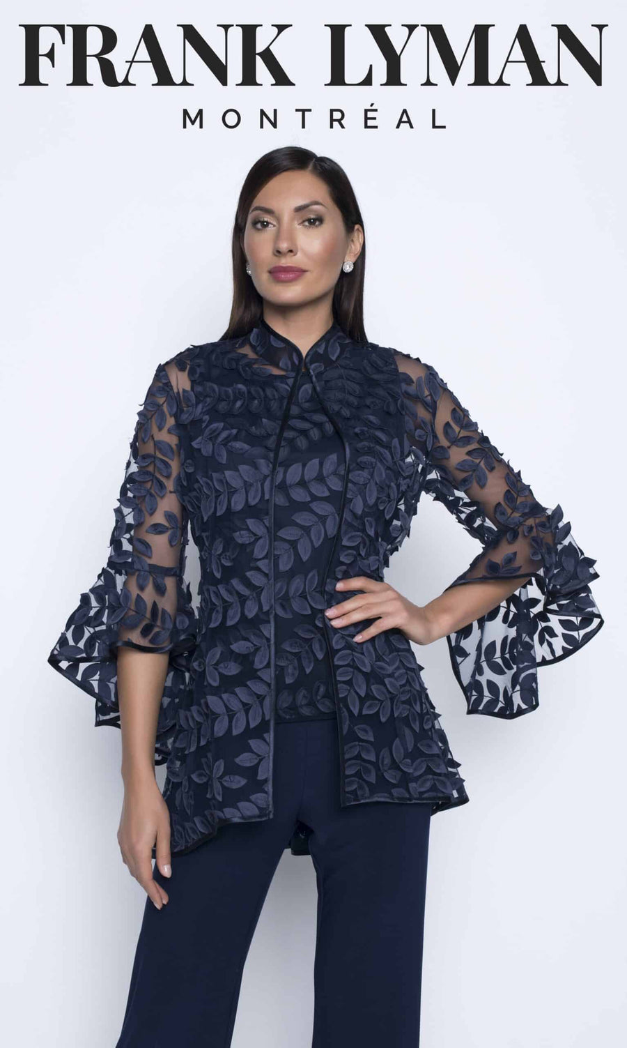 Elegant leaf applique evening jacket with sleeve detail in striking midnight color. Pair back with basic camisoles . Easy care fabric, hand wash cold water, 100% polyester. Leaf applique on front and back with hook & eye enclosures. Unlined and approx.