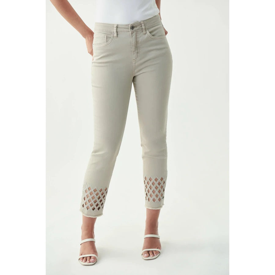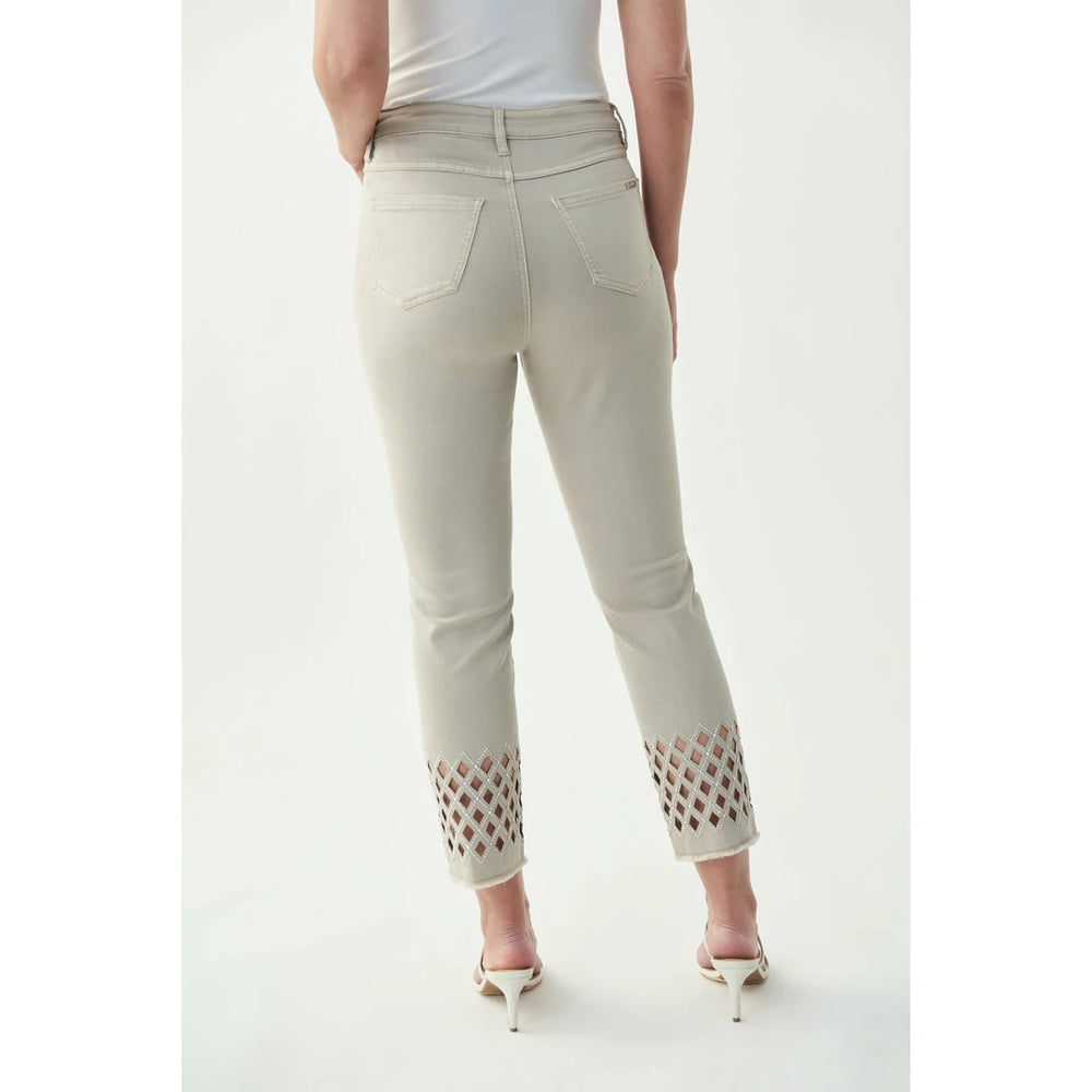 Gorgeous Joseph Ribkoff crop jeans featuring eye-catching cut-out detail along the ankle and added unique detail of shimmering rhinestones.