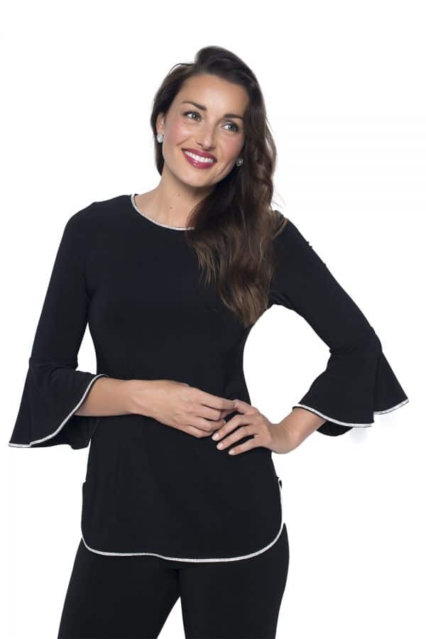 Elegant evening top with diamonte embellished edges and belle sleeve. Flattering silhouette. Easy care, hand wash cold water, 96% polyester, 4% elasthane. Embellished on front & back. Unlined and approx.