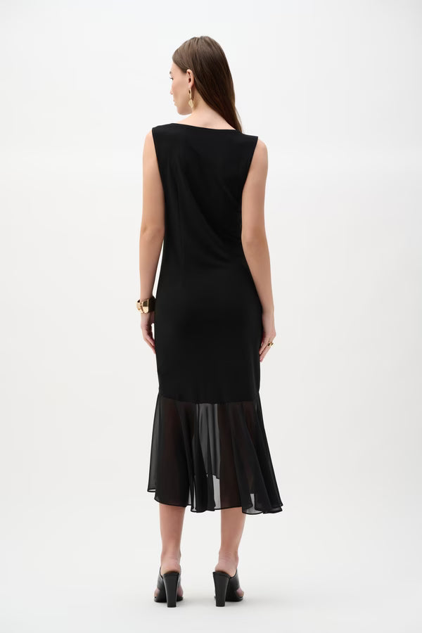 Step into sophistication with this Joseph Ribkoff midi sheath dress. Designed with a boat-neckline and ruffled details, this dress is perfect for both formal and semi-formal occasions. Its sleeveless, feminine style and plain pattern offer a timeless elegance, ensuring you make a lasting impression. Embrace the art of refined fashion with this exquisite piece.